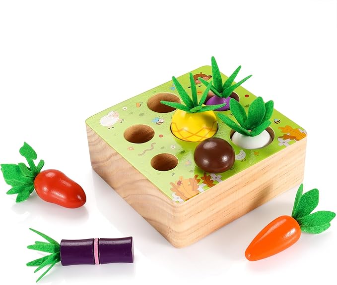 - 🥕Fun & Challenging Sorting Game for Kids: Designed to fit small hands to grab, give your toddler plenty of time to explore the puzzle pieces on their own. The wooden Montessori toys will help your kid to built their intelligence and perception of shape while pulling out and back into the matching holes. Great for brain building, fine motor skills and hand-eye coordination improvement.