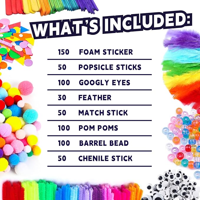 • Materials included cleaners, colorful popsicle sticks, craft matchsticks, buttons, adhesive googly eyes, assorted size pom poms, craft feathers, foam sticker shapes
