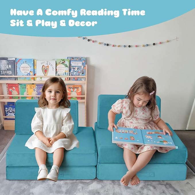 MeMoreCool Modular Kids Play Couch Sofa, 8-Piece Convertible Turquoise Toddler Sofa Play Set for Playroom and Baby
