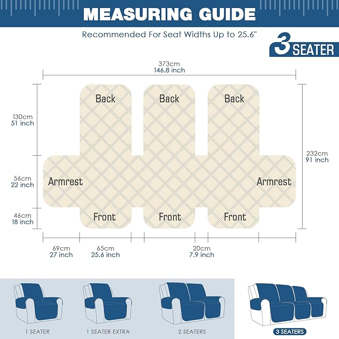 - 【DIMENSIONS GUIDE】 New colors and styles will make your furniture more unique and welcoming. 3 seater recliner cover fit a sofa with a seat width of 76.8 in, see measurement guide in photos. NOTE: Please confirm the size before purchasing