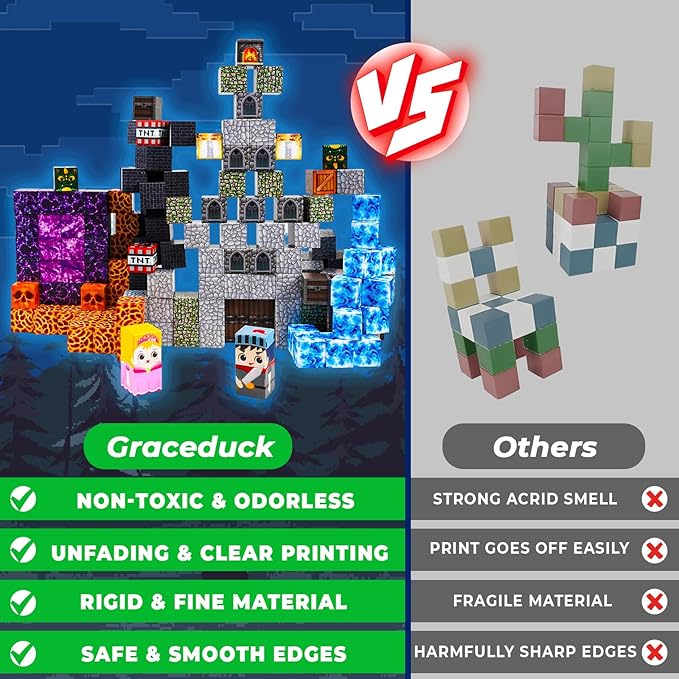 - 【Dark Castle Sword Domain Magnetic Cube Kit】Including 150 Magnetic cubes in 18 colors. Idea booklet with the storyline and beautiful patterns, keep them busy in clever ways. GraceDuck magnetic activity cubes are made of high-quality ABS material and crafted with round edges and the right size. Unlike other Magnetic toys on the market, our magnetic cubes kit with super strong internal Magnetic, which is easier for toddlers ages 3+ to stick the cubes together and make builds sturdy. Perfect STEM toys help kids gain a deeper understanding of the structure and learn about magnetic properties!
