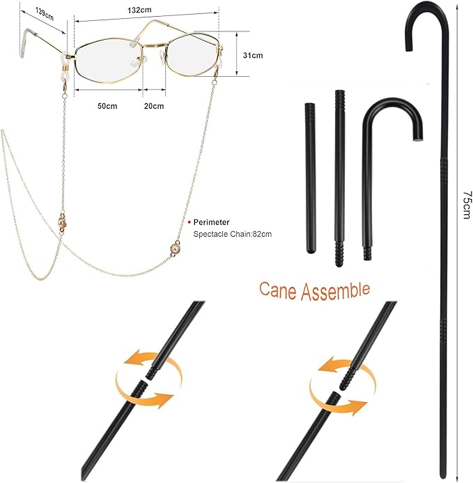 - YouthBro Full Old Lady Costume Pack with 1 x old lady costume dress clothes; 6 x pink HairCurlers; 1 x old lady wig; 1 x black cane; 1 x granny glasses; 1 x grandma costume eyeglass chains strap; 1 x faux pearl beads necklaces; 1 x fake pearl beads earrings; 1x faux pearl beads bracelet; 1 x wig cap; 1x black handbag