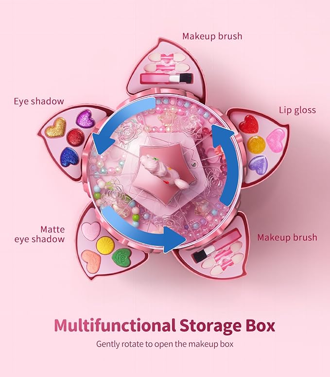 - 【Toddler Vanity With Unique Storage】The makeup kit for kids is made with a twist to open the bottom makeup tray, which includes eye shadows, blush, lip balm, and makeup brushes. The top layer of the box offers unique storage space, perfect for keeping beads and jewelry accessories organized without messy.