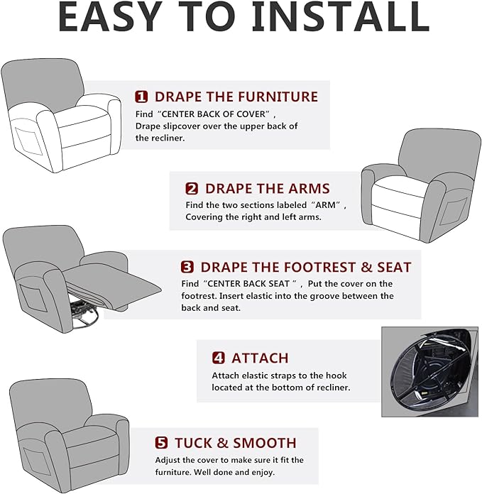 - NON SLIP: The premium elastic edges and fixed ropes ensures that our recliner covers stay in place, so you don't have to worry about messes caused by kids and pets when using reclining chair