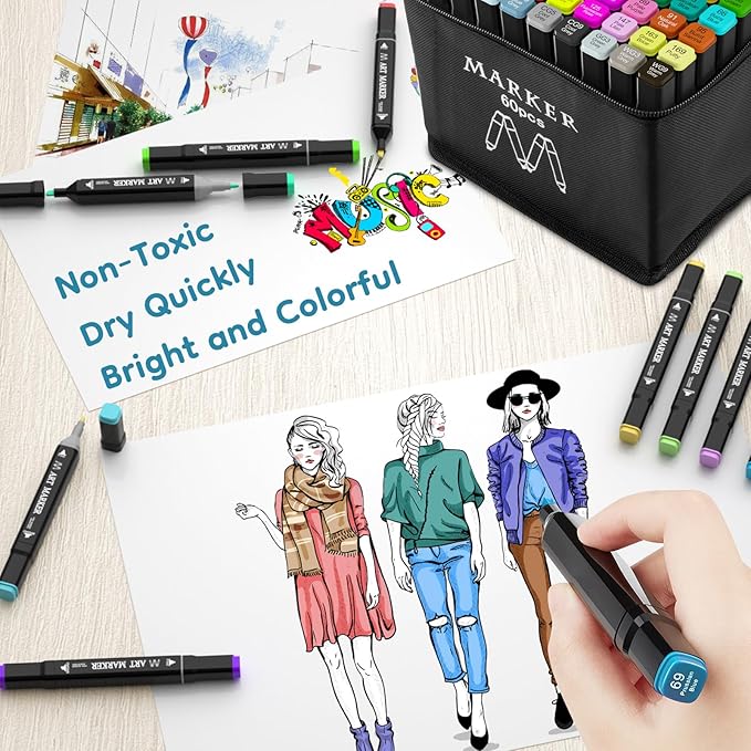 Alcohol Markers Set, 60 Colors Dual Tip Art Marker for Kids Sketching Adult Coloring, Permanent Drawing Marker with Case and Holders