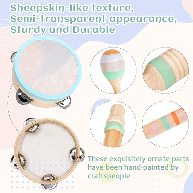 - â¨ăExquisite CraftsmanshipăThe drum surface of the tambourine is crafted from imitation sheepskin, offering a semi-transparent appearance and a realistic texture, ensuring durability and resilience. The clarinet, wood sounder, hand bell, and two maracas are adorned with intricate hand-painted designs. This meticulous hand-painting process not only requires considerable time and effort but also results in stunning, individualized pieces, each displaying unique beauty and charm.
