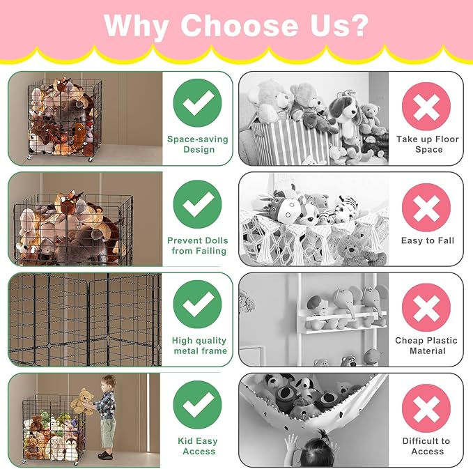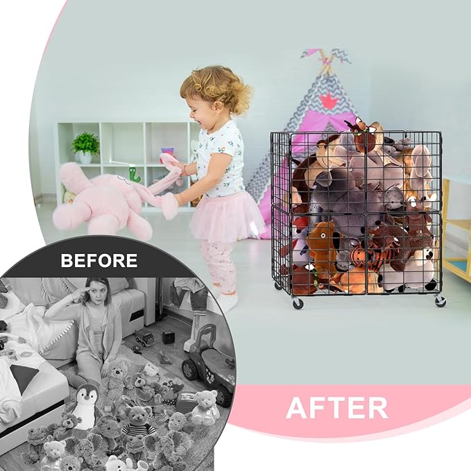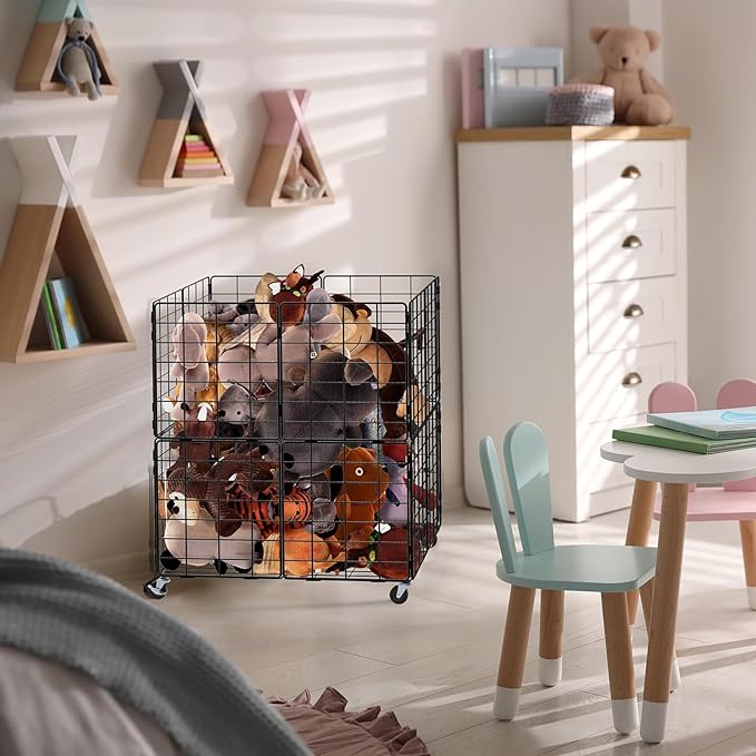 - STUFFED ANIMAL PLAYHOUSE:Our stuff animal organizer takes up little space and has a large capacity, helping to put an end to the chaos of your stuffed animals and making our room more organised. The overall hollowed out metal structure design is more convenient for storing and accessing toys. With four wheels on the bottom, it is easy to move and can be stored anywhere. Two of the wheels are lockable and can be easily positioned
