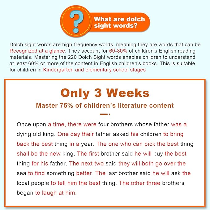 - Master 220 Dolch Sight Words in 3 Weeks: Each flash card features vibrant cartoon pictures and related sentences, helping kids ( from pre-kindergarten to 3rd grade) understand and memorize words in context. The included 8 dry-erase markers allow kids to practice writing repeatedly, reinforcing memory. Following a structured study plan based on the Ebbinghaus forgetting curve theory, kids can efficiently master 220 Dolch sight words within 3 weeks