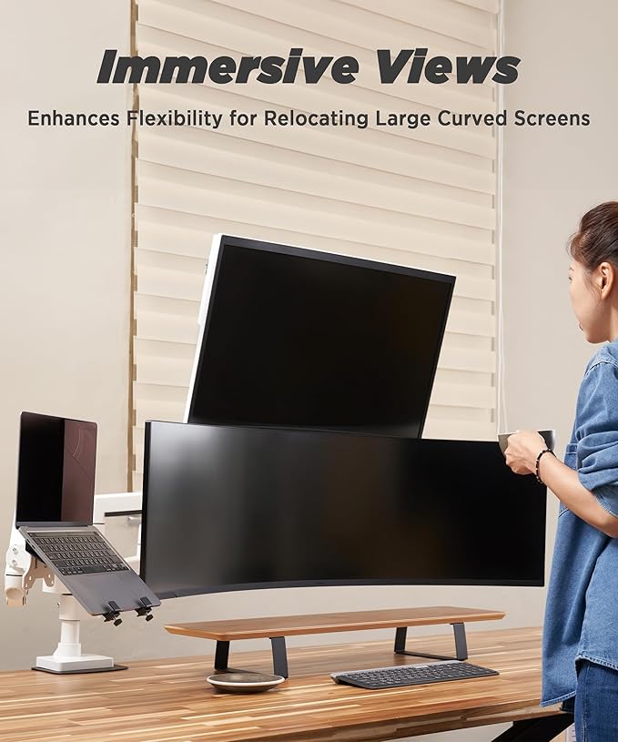 - Fits Ultra Wide Monitors - Holds one screen weighing up to 44 lbs. Fits ultrawide monitors up to 57" and downward compatible 49" to 24" flat, curved up to 1000R screens. The quick-release VESA bracket has 75x75mm and 100x100mm mounting capability.