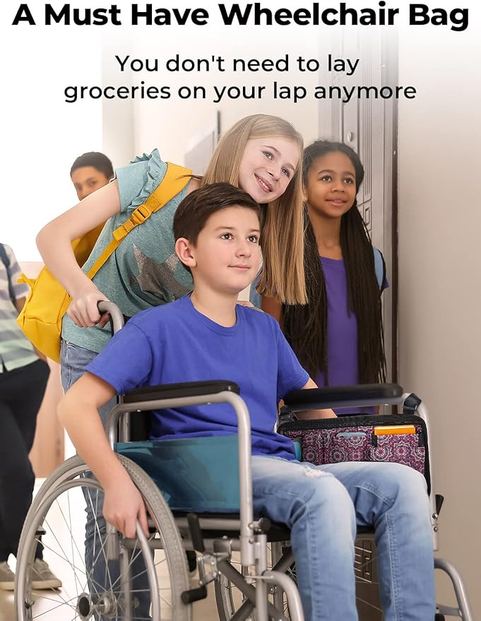 - 【Perfect Fits Standard Wheelchairs】: With 2 front pockets, one zippered compartment and 2 back pockets. With two 13.3'' bands, this armrest bag can be mounted inside or outside of an electric wheelchair, rollator, scooter, mobility chair, walker or rollator
