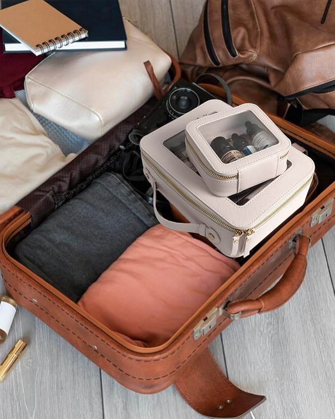 - Clear Design: Our 2Pcs Travel Makeup Bag is elegant ,and stylish, this makeup travel organizer was designed in a minimalist boxy shape,is sleek and minimalistic look for your makeup accessories collection. And is designed with a transparent PVC window,all items are clear at a glance, and you can quickly choose the cosmetics you need.Portable and lightweight Slip it into your purse, backpack, everyday tote or travelling bag for easy access to your must-have items. Large Size Measuring 9.84'' x 7.67'' x 3.14''(25cm x19.5cm x 8cm), Mini Size 5'' x 4.7'' x 2''(12.7cm x 12cm x 5cm).