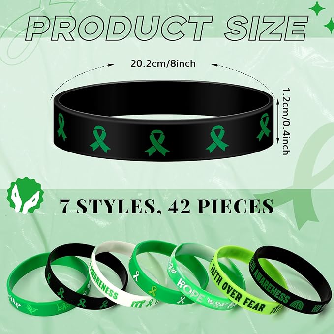 JUNEBRUSHS 42pcs Mental Health Awareness Silicone Wristband Bulk Green Ribbon Inspirational Rubber Bracelets for Mental Health Awareness Faith Courage Hope Party Favor Gift Supplies(7 Style)
