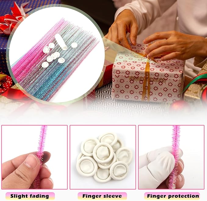 - Size: 100pcs 10 colors glitter pipe cleaners 0.24 X12 inch (6 mm x300 mm); 10pcs white disposable latex finger covers 55-60 mm