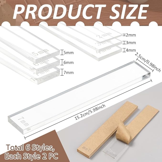 BENECREAT 12Pcs 6 Size Acrylic Polymer Clay Depth Guide Set, 2,3,4,5,6,7mmAdjustable Clay Rolling Pin Guide with Protective Film for Polymer Earrings, Roller Depth Guides