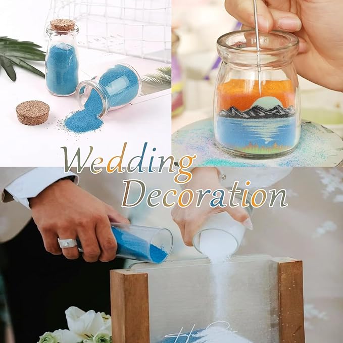 - Premium Quality:Our colored sand is uniform and fine,easy to flow,and won't clump and fade.You can paint beautiful sand paintings with canvas and glue or paint in various bottles with different colors of sand.
