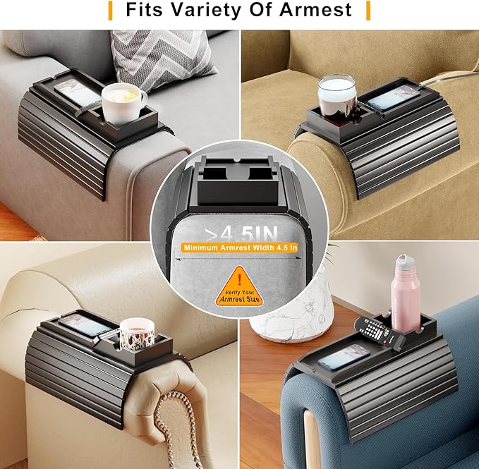 - ✅ 【Fits a Variety of Sofa Armrests】Our sofa tray table for couches applies to most sofas, for wide armchairs, flat, rolls, and straight arms, Our couch arm side table fits arms 4.5” (flat) to 14” rolls or straight arms.