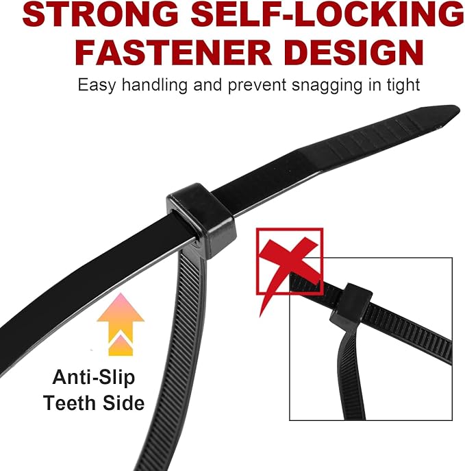 - SELF-LOCKING DESIGN: Self-locking black nylon zip ties fastener design provides a secure and reliable fix. Super strong powerful lock, easy handling and prevent snagging in tight