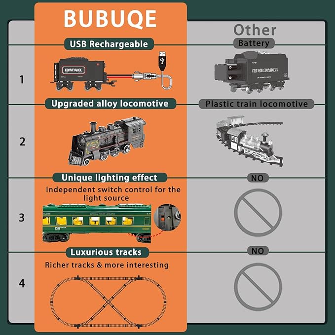 - 👍✨【Alloy Material, Safe, High Quality】: The locomotive steam is made of high-quality alloy materials, which are more durable and impact-resistant than plastic, cheap, battery-powered trains on the market. The train set has passed the US toys test, ensuring a safe and enjoyable experience for kids and families.