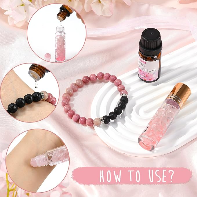 - AROMATHERAPY AND RELAXATION : Step into a realm of soothing aromatherapy with our essential oils, designed to elevate your mood and create a serene atmosphere. The bracelets and roll on bottle with gemstone rollerball&crystal chips are your companions in this aromatic journey. Drop essential oils onto the wooden beads of your bracelet or pour into a tumbler, allowing you to carry the scents that resonate with you wherever you go, filling your sanctuary with a calming and luxurious ambiance
