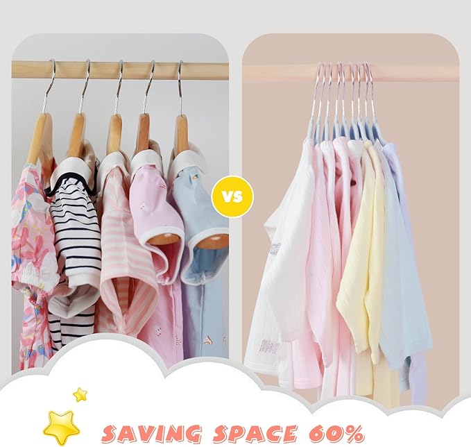 - 【Non-slip design】- The baby hangers are covered with soft, non-slip, odourless and non-shedding velvet, which is more suitable for toddler clothes. The curved shoulders of the children's hanger keep your child's clothes in good shape and protect them from wrinkling or deformation. The V-shaped grooves at the ends of the hanger prevent baby's clothes/children's dresses from slipping off.