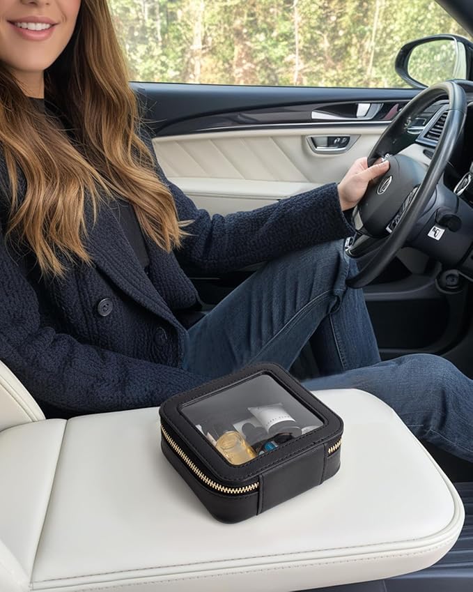 • Car Must Have Essential: Our car essentials small pouch travel toiletry bag is roomy to store your makeup brushes, lipstick, eyebrow pencil, make-up foundation, cables, chargersor and other little items.It make your daily make-up, cream, lipstick, perfume and other beauty things organized and protected.This clear mini toiletry bag can be a good car accessory fits in the center console or other parts of your car.