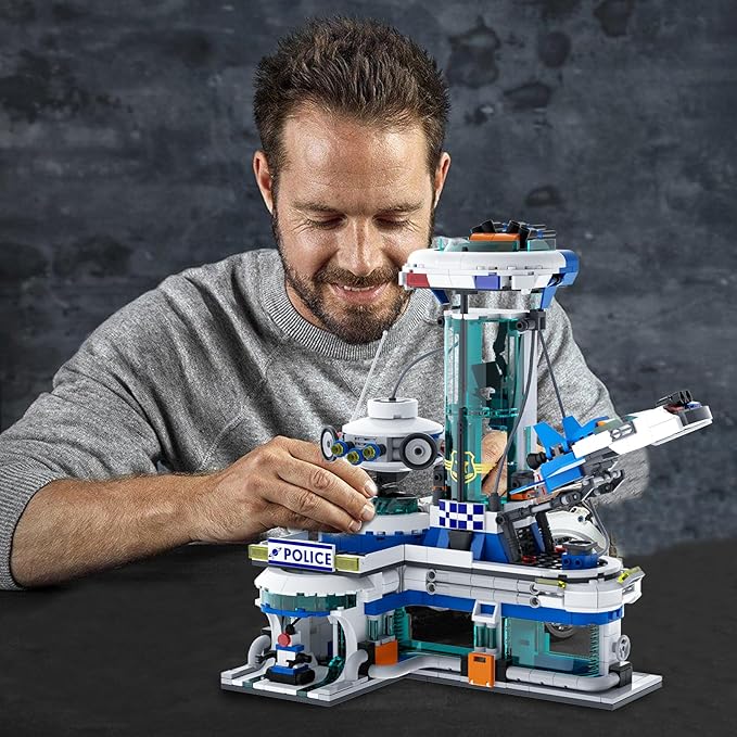 - Space Police Station Set: Kids can build a 2-level QLT space police station with 905 building blocks, including a small spaceship, police robot and machine gun to simulate space missions and protect the city from crime.