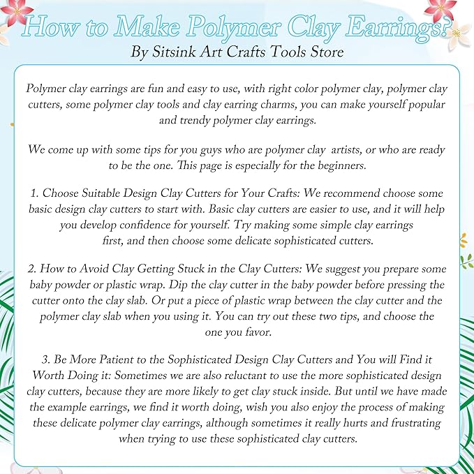 - Tips for Making Polymer Clay Jewelry: We suggest you add some baby powder or corn starch for help, it will help release the clay from the cutters. Just dip the cutter on the baby powder before you press the cutter on the polymer clay slab.