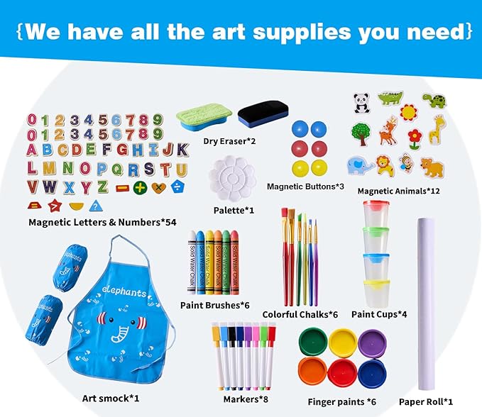 - 【Luxurious art accessories】You will get 2 paper rolls, 6 finger paints, 4 markers, 4 paint pots, 6 round magnetic buttons, 1 set of magnetic letters and numbers, 1 dry eraser, 5 paint brushes, 1 palette board, 1 art smock and 12 colored chalks. Art has no age limit. Embark on an artistic journey with your children.