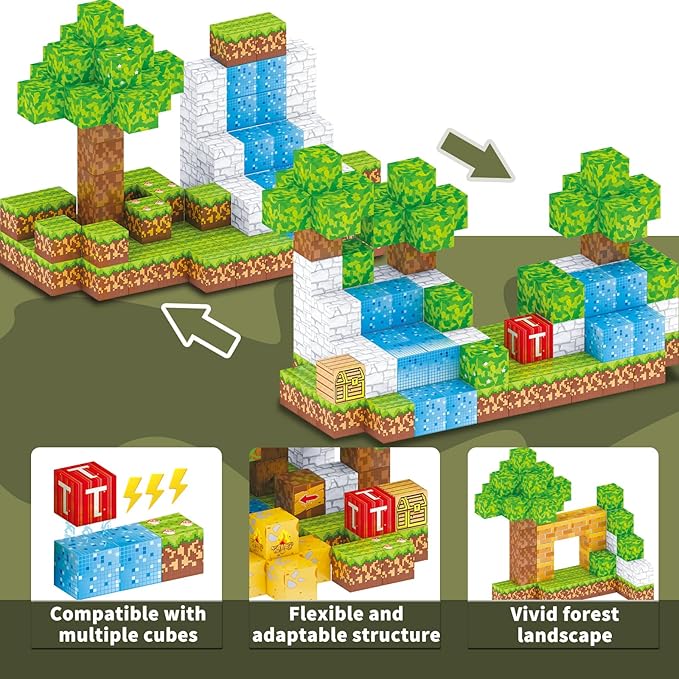 - 【Build mini magnetic block forest set】 Ready for the fun of making your small world come to life? Check out our newest magnectic cube sets! Build your own castle and forest, bring your dinosaur and army toy to get started to have fun with a role-playing adventures with your friends using our cube toy. Our magnetics cubes contain 8 individual magnets within the block and compatible with other existing products in the market, creating more possibilities of fun for kid to fully satisfy their curiosities and creativities.