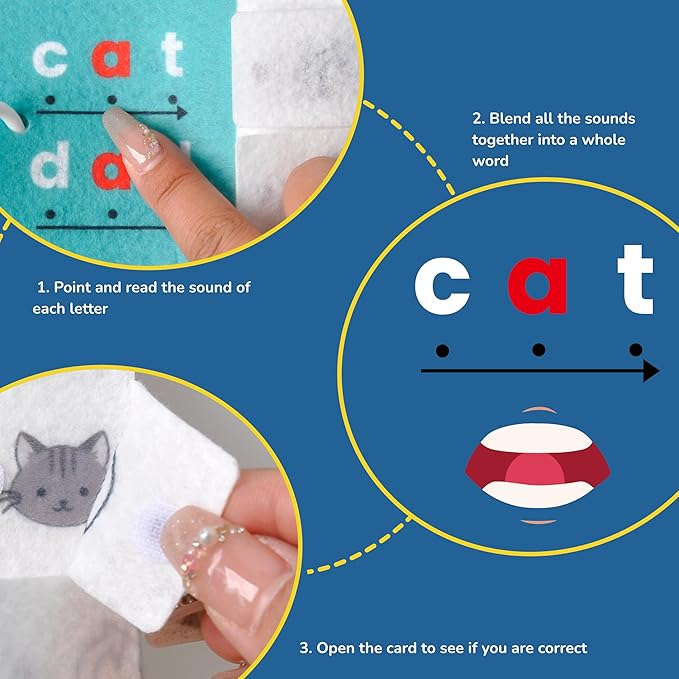 - How to Use:Children can learn 114 CVC words formed by 5 vowels through syllable blending,word reading,and matching cards.First,practice pronunciation through "Point and Read,"then blend all the sounds for reading,and finally,open the folded felt part to reveal the picture for self-checking.