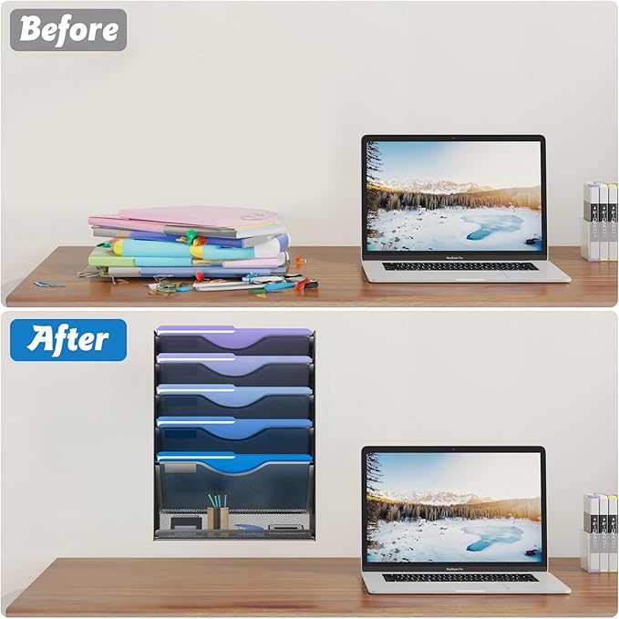 - ✏️ Multiple Compartments: 6-tier wall-mounted file organizer for storing files, with small label panels to mark the contents of each layer and 1 flat tray for small tools or supplies.