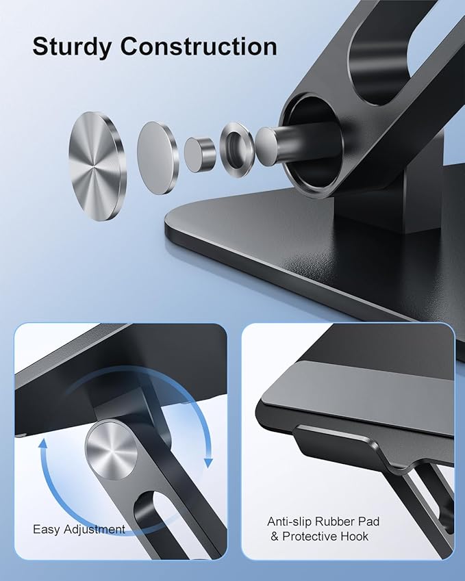 - Durable and Stable. Featuring an 8kg/18lb weight capacity, this aluminum laptop stand can hold various laptops ranging from 10 to 17.3’’ without wobble. Larger-sized base with non-slip rubbers and protective hooks provides extra stability and security for your laptops.