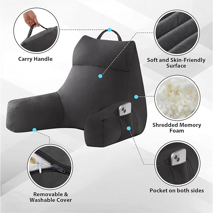 - 【Convenient Storage】Designed with handy side pocket storage in the arms, this back support pillow keeps your essentials—like phones, glasses, books, tablets, or remotes—neatly organized and within easy reach. No more fumbling for your devices!