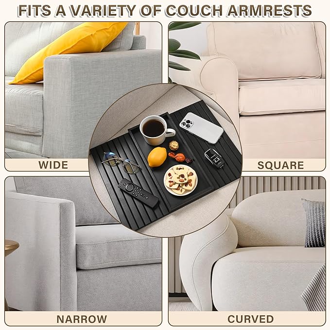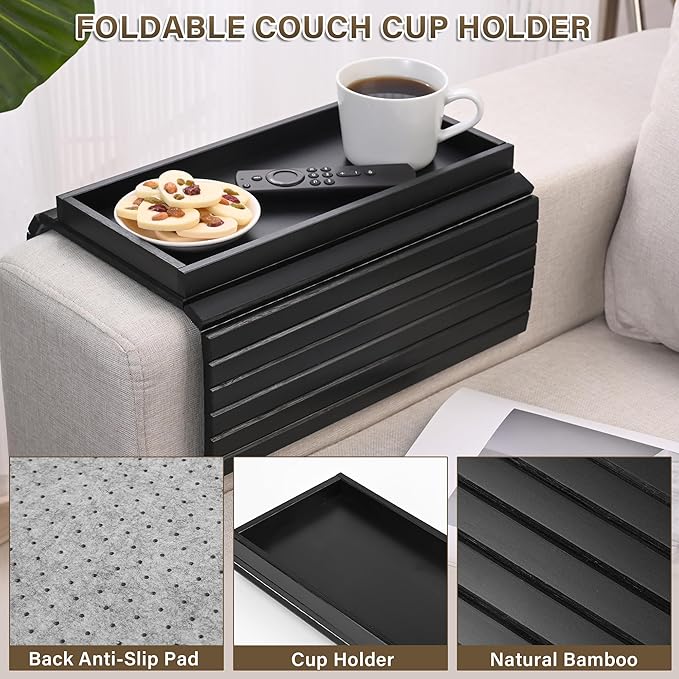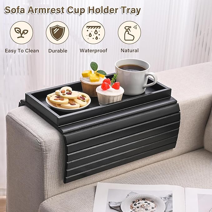 - STABLE TRAY & SOFA PROTECTION: The anti-drop baffle design of this couch arm tray can keep your drinks, snacks, and remote control stable and not easy to spill! The EVA felt anti slip pad on the back ensures that the couch cup holder tray can effectively adhere to the sofa armrest and is not easy to fall off, while protecting the sofa from injury.