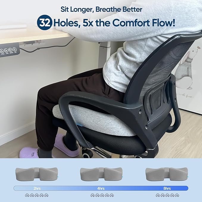 - 32 Air Vents: Breathable butt cushion features 32 air holes for airflow. This design improves breathability, allowing air to circulate from the gel sheet and memory foam cushion to the base. Even long hours of sitting, our cushion reduces sweat and odors, providing a refreshing seating experience. Say goodbye to discomfort and hello to comfort with butt pillow