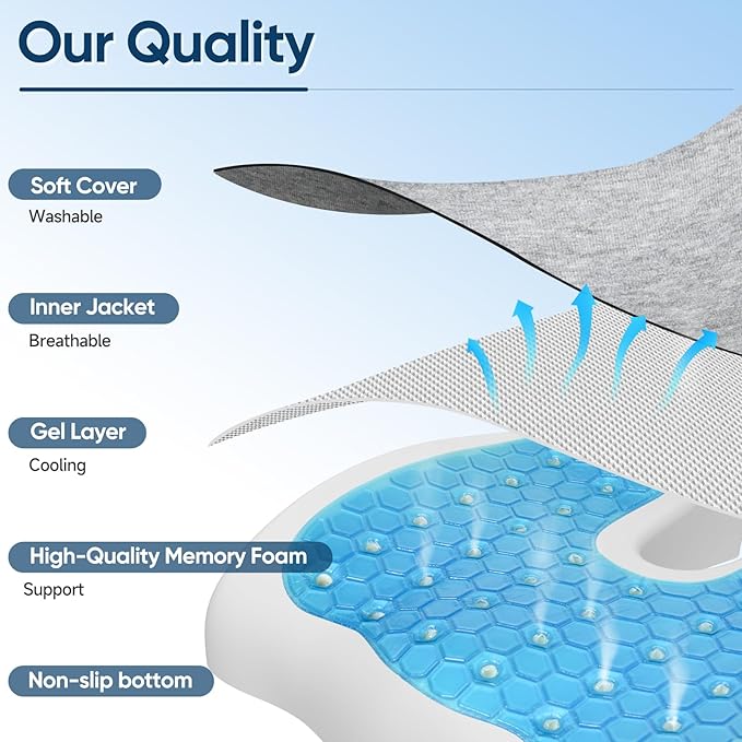 - Five layers of protection make up ergonomic office chair cushion: A soft cover/ breathable inner cover/ cooling gel layer/ memory foam pad with support & non-skid bottom layer. Each element is meticulously crafted to enhance comfort during long sitting