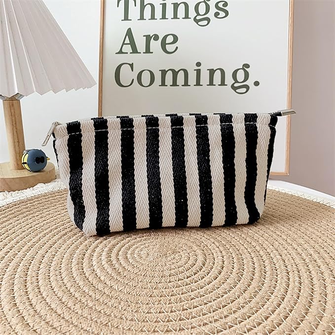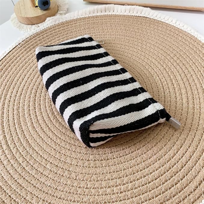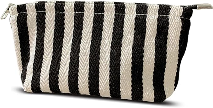 HAPPYHEIDI Small Black White Stripe Makeup Brush Bag Zipper Pouch Women Girls Purse Organizer,Canvas Lined, Premium Zipper