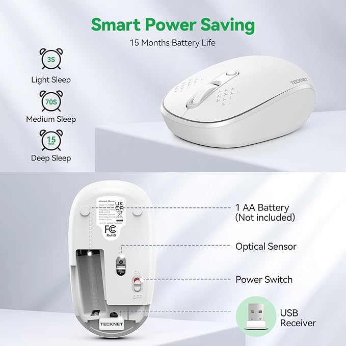 - 【Easy to Use Laptop Mouse】 TECKNET travel mouse comes with a nano receiver (stored IN the mouse). 2.4GHz wireless technology ensures reliable connectivity up to 49ft. 3 adjustable DPI levels (1600/1200/800) to meet your different needs. Only need 1xAA battery (NOT included) to support up to 15 months battery life.