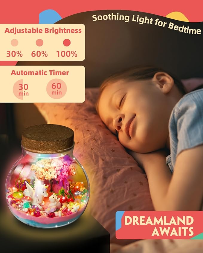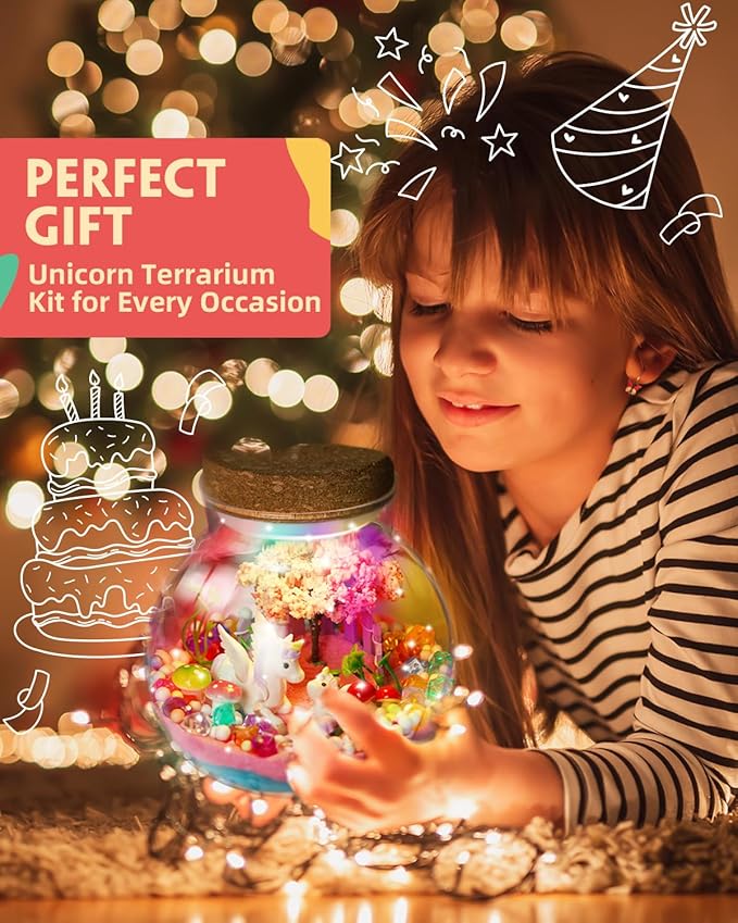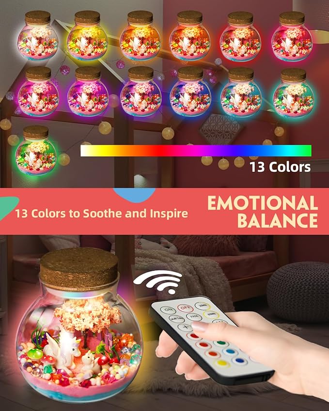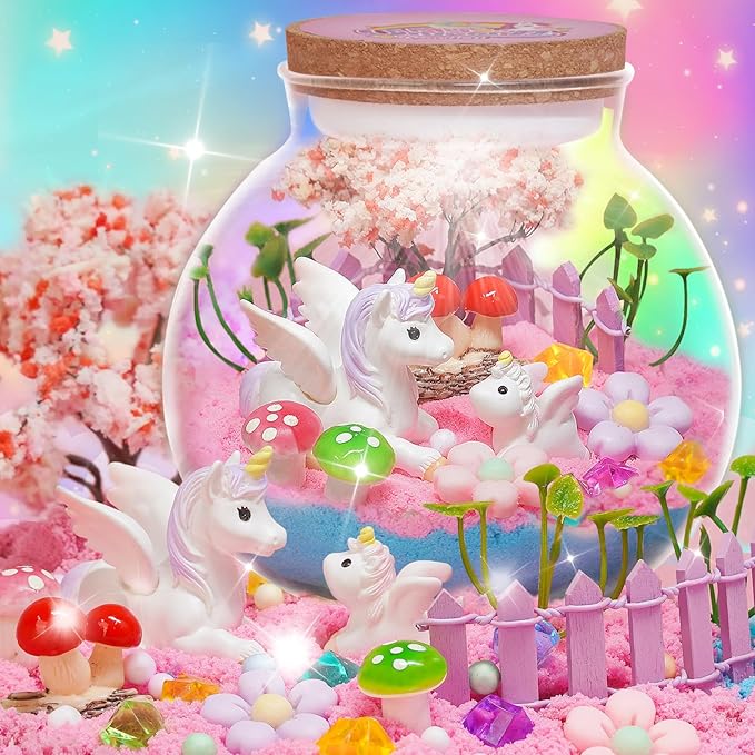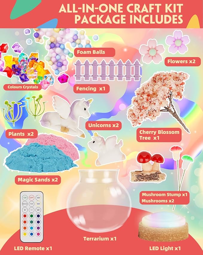 - Complete Unicorn Garden DIY Night Light Kit: Our unicorn terrarium kit for girls includes everything needed to create a magical unicorn fairy garden : clear jars, a 13-color LED night light, a remote control, adorable unicorn figures, sparkling crystals, magic sand, cherry blossom trees, flowers, mushrooms, and more decorative ornaments. This comprehensive set provides your child with a delightful and imaginative crafting experience