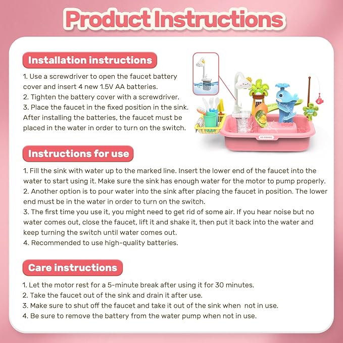 - [Unique Shaped Electric Faucet] The kitchen sink toy features a charming cloud-shaped electric faucet with an automatic water circulation system. Powered by 4 x 1.5V AA batteries, this faucet includes a waterproof motor for smooth water flow. As part of the kids sink with running water, its 90-degree rotation adds flexibility and fun, while also helping to improve fine motor skills and hand-eye coordination.