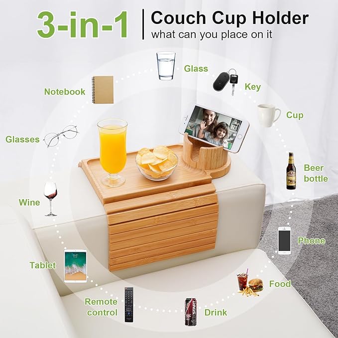 - 🎁The Perfect Couch Arm Cup Holder:Our couch cup holder tray, also referred to as a couch table tray, makes a thoughtful gift, suitable for dorms, living rooms, and offices.It's an excellent choice for various occasions, including birthdays, holidays, or simply as a gesture of appreciation