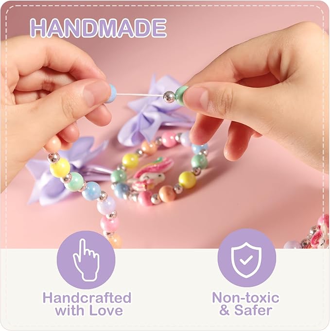 - WELL HANDMADE - Play at Ease: 1. Superior DOUBLE-LAYERED elastic string makes the bead necklace and bracelet sets more sturdy, they will hold up to the constant putting on and taking off by your little girl. 2. All materials are SAFE and DURABLE. Beads: acrylic. Unicorn charms: resin. Bow: poleyster. Elastic band: rubber. Earring Hair Clip: alloy. Friendly to skin.