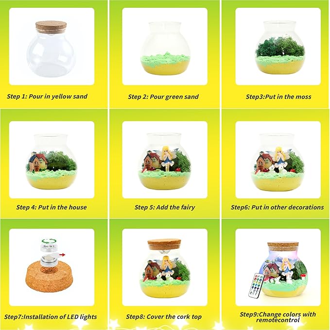 - 【Fun DIY Fairy Terrarium Kit】: This terrarium kit comes with everything kids need and simple, clear instructions, making it easy for them to create and decorate their very own Fairy night light. With bright Fairy figurines and colorful decorations, your child will have a blast personalizing their magical underwater scene.