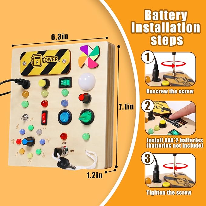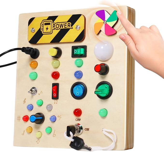 - Toddler Montessori Busy Board - This toy is designed for kids who love switches and LED lights. This wooden toys is set with 10 different switches, each corresponding to a different color or style of LED light.the same time, this busy board also has a master switch to turn off all the lights with one click to avoid tedious operation.The board also comes with a pinwheel to keep your child occupied throughout the journey