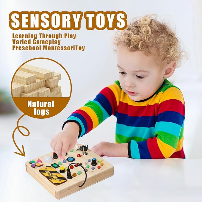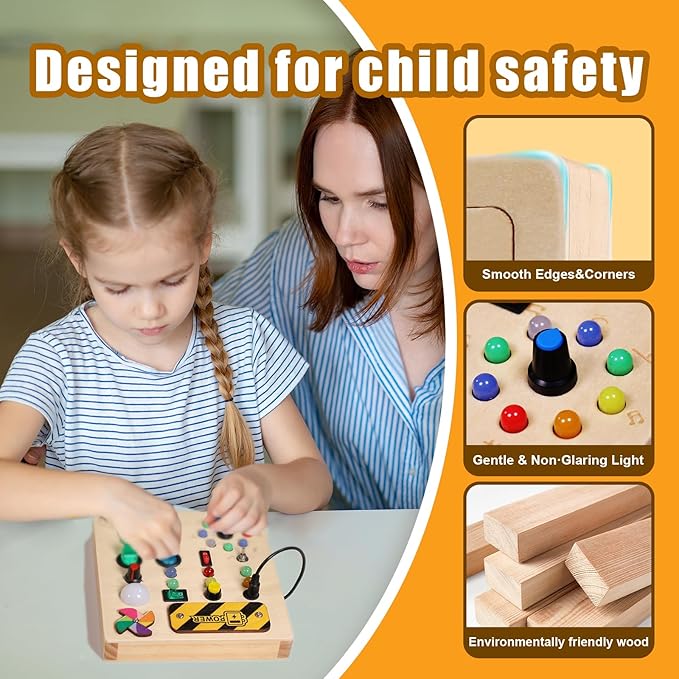 - High Quality Sensory Toys - Our toddler fidget toys are made of natural wood with smooth edges. All the various buttons, switches, and shifters are securely installed. The busy board with led lights is high quality and very sturdy, ensuring safety for your child. The light is soft and won't hurt children's eyes