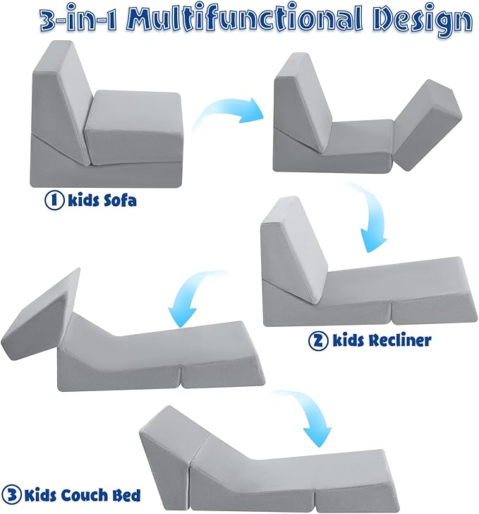 - [3-in-1 Toddler Lounge Chair] The kids' sofa chair features a flip out and inclined back, and converts to a floor couch bed, the child can sit, half recline, or lie down comfortably