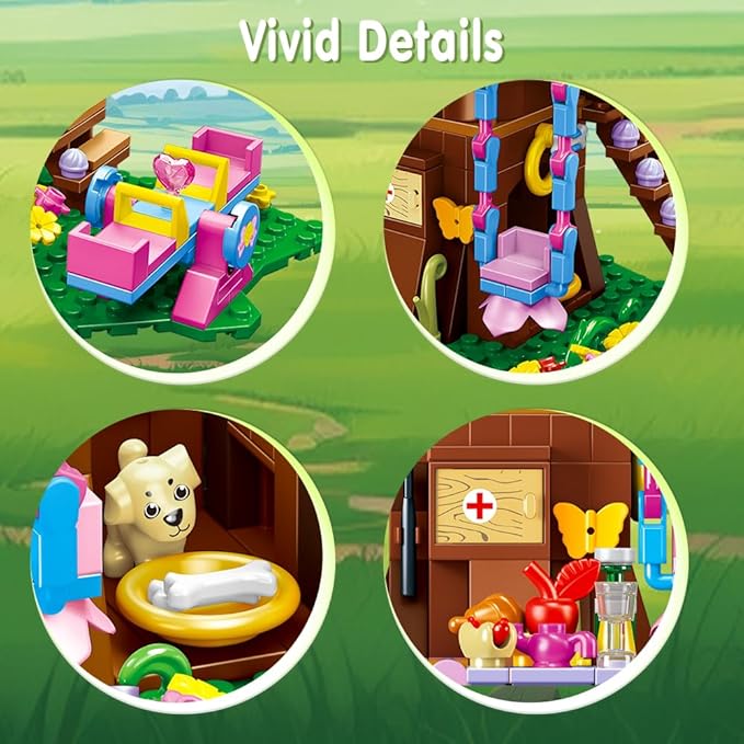 - EXQUISITE TREE HOUSE: Explore the wonder and fun of nature with this well-designed treehouse building set. Its exquisite exterior and rich details, such as the living room, utility room, dog kennel, and vibrant planting area, transport children to a world of imagination. The set also includes an adorable puppy and a lively squirrel to add to the children's adventure