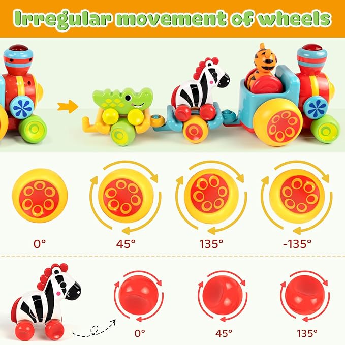 - 【Preschool Learning Toys 】Toddler can push and pull this baby toy for 18-24 months or use string to pull it around to learn cause and effect. Meanwhile, they can play these push-and-go toy cars individually to exercise hand-eye coordination and stimulate curiosity and cognitive development. Children also can recognize the forest animals from these cute eye-catching cartoon cars. This Montessori train toy set is great educational resource for 1 2 3 4 yr old boys and girls.