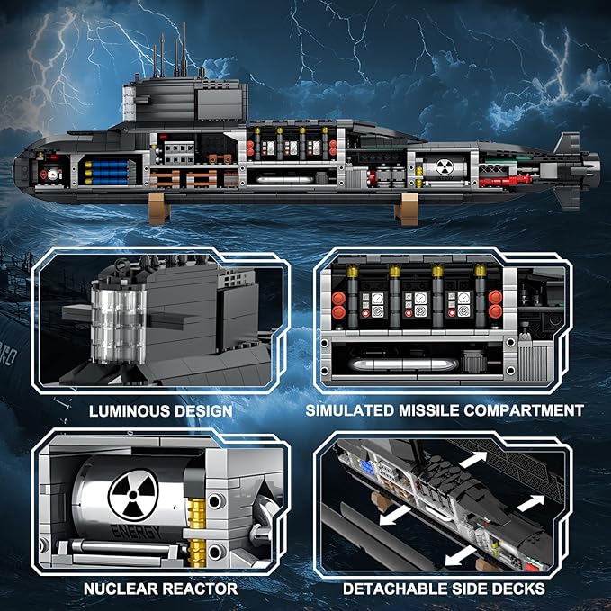 - 【Advanced & Cool Strategic Nuclear Submarine】This is a cool and innovative military nuclear submarine toy with realistic design and fine craftsmanship. Including radar antenna, direction finder, sonar detection, LED lights, torpedoes, control room, missiles, nuclear reactor, Every detail of the design will amaze you. The side deck is flexibly detachable, allowing you to easily see the complete interior design and satisfy all your expectations for a military model.