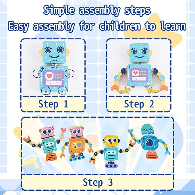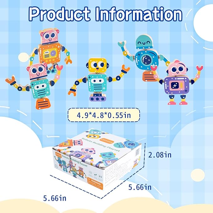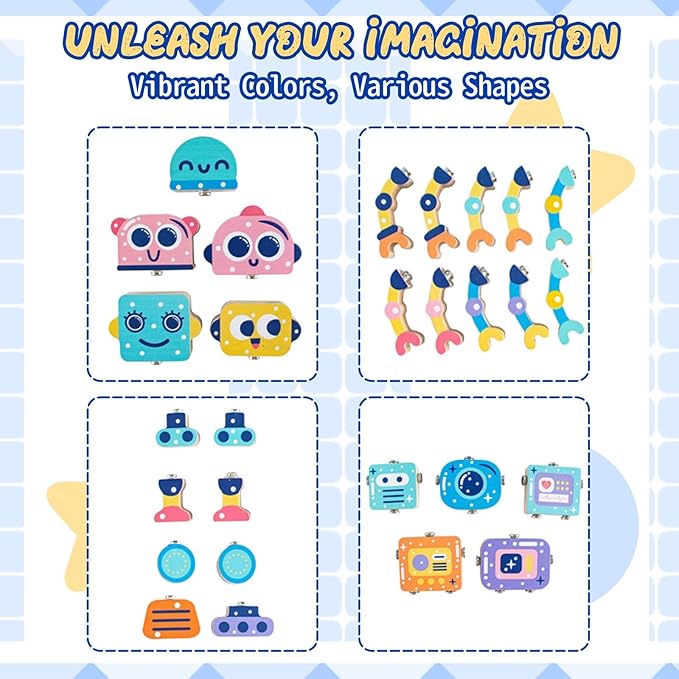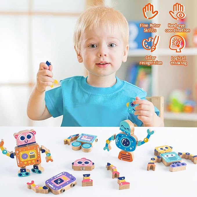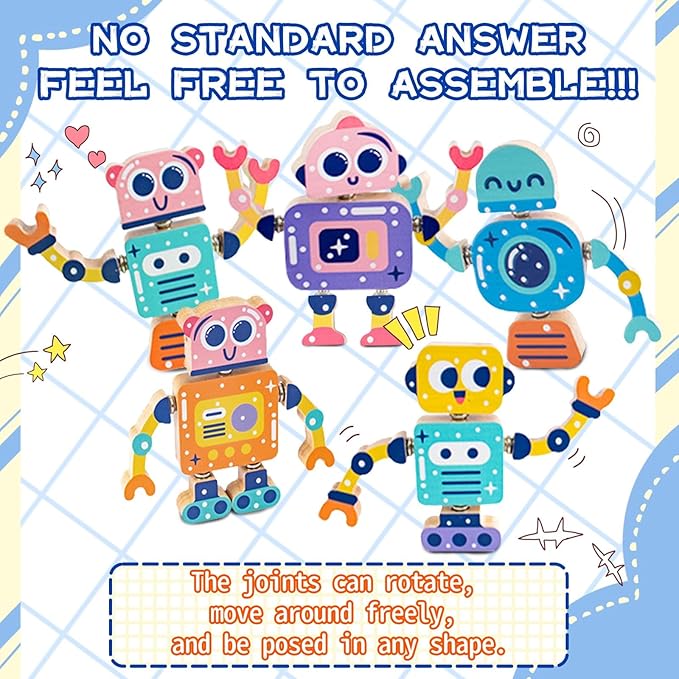 - NO STANDARD ANSWERS! UNLIMITED CREATIVITY - These wooden robot building blocks offer unlimited possibilities; children can freely combine to create five different robots. With 5 heads, 10 arms, 8 legs, and 5 body parts, kids can mix and match, igniting their creativity and imagination.